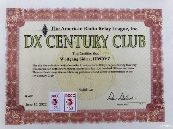 DXCC Satellite Certificate No. 401 - June 2022