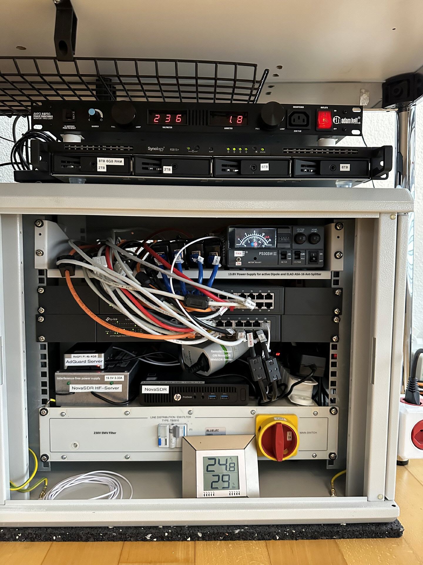 Inverted-V Antenna with just two short 6.5m legs - Stockcorner JC-4s Tuner (ATU) - 10.8m symmetric ladder line (Wireman 450 Ohm) - 6.3m Fiber-Mast DX-Wire Heavy-Duty - 1171 Design Baluns 1:1 current Choke 5kW